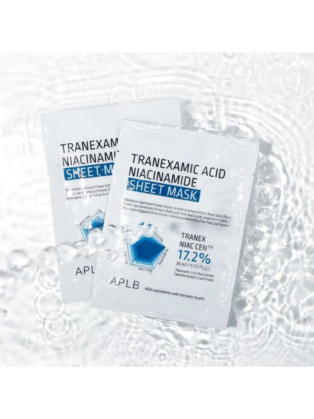 APLB Tranexamic Acid Niacinamide Sheet Mask Rozjasňující a hydratační pleťová maska s niacinamidem okamžitě rozjasňuje pleť, pomáhá vyrovnávat tón pleti, redukuje nedokonalosti a hydratuje mdlou a nevýraznou pleť.