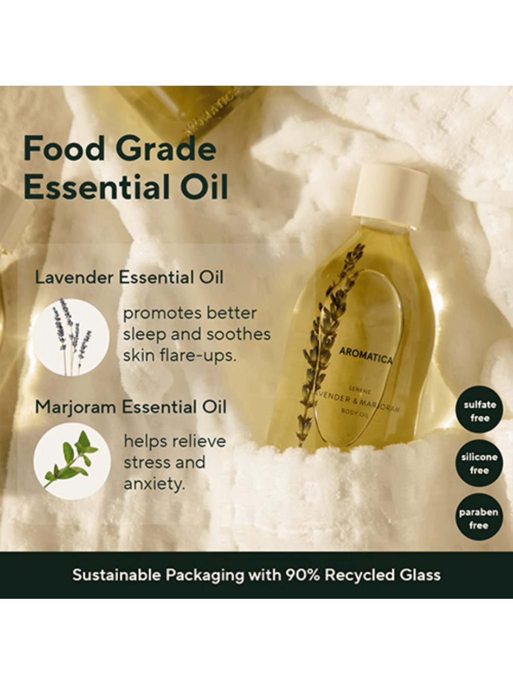 Zklidňující tělový olej s levandulí a majoránkou vyživuje suchou pokožku, zmírňuje napětí a zanechává sytý lesk bez mastného filmu.