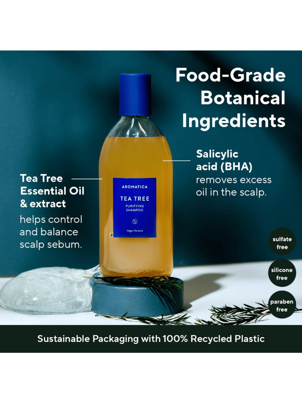Hloubkově čisticí veganský šampon pro mastnou pokožku hlavy s tea tree a BHA jemně odstraňuje kožní maz, okamžitě osvěžuje a zanechává vlasy svěží a lehké po celý den.