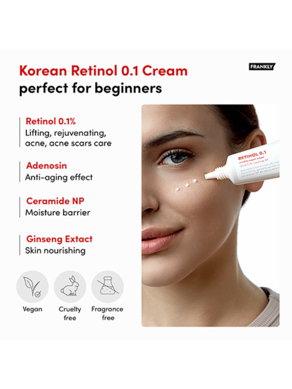 Retinol 0,1 krém od FRANKLY je noční regenerační krém pro každého, kdo chce mít viditelně hladší, jasnější a pevnější pleť bez zbytečného stresu. Spolehněte se na 0,1% retinol, který podporuje obnovu kožních buněk, zjemňuje vrásky a nerovnosti, zatímco niacinamid rozjasňuje a vyrovnává tón pleti. Bohaté, ale příjemně krémové složení je vyvážené ceramidem NP, cholesterolem, beta-glukanem a hydrolyzovanou kyselinou hyaluronovou, které posilují kožní bariéru a udržují dlouhodobou hydrataci. Vyživující složky, jako je bambucké máslo a makadamiový olej, pleť zjemňují bez pocitu zatížení, zatímco výtažky z centella asiatica a řas ji zklidňují. Díky pokročilým emulgátorům (cetearyl olivát, sorbitan olivát) se krém krásně roztírá a nezanechává mastný film. Pokud chcete krém, který přes noc skutečně funguje a ráno se probudíte s plnější a hladší pletí, je to váš nový rituál.