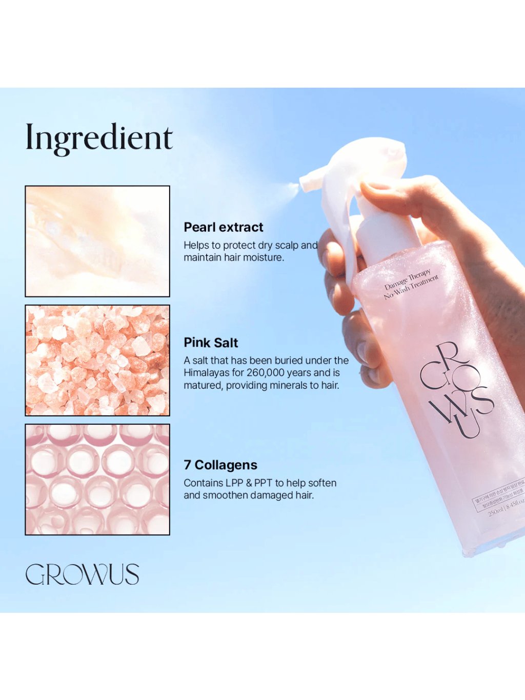 GROWUS - Damage Therapy No-wash Treatment EX - Regenerační sprej bez oplachování s mořskými enzymy, kolagenem a proteiny 250ml