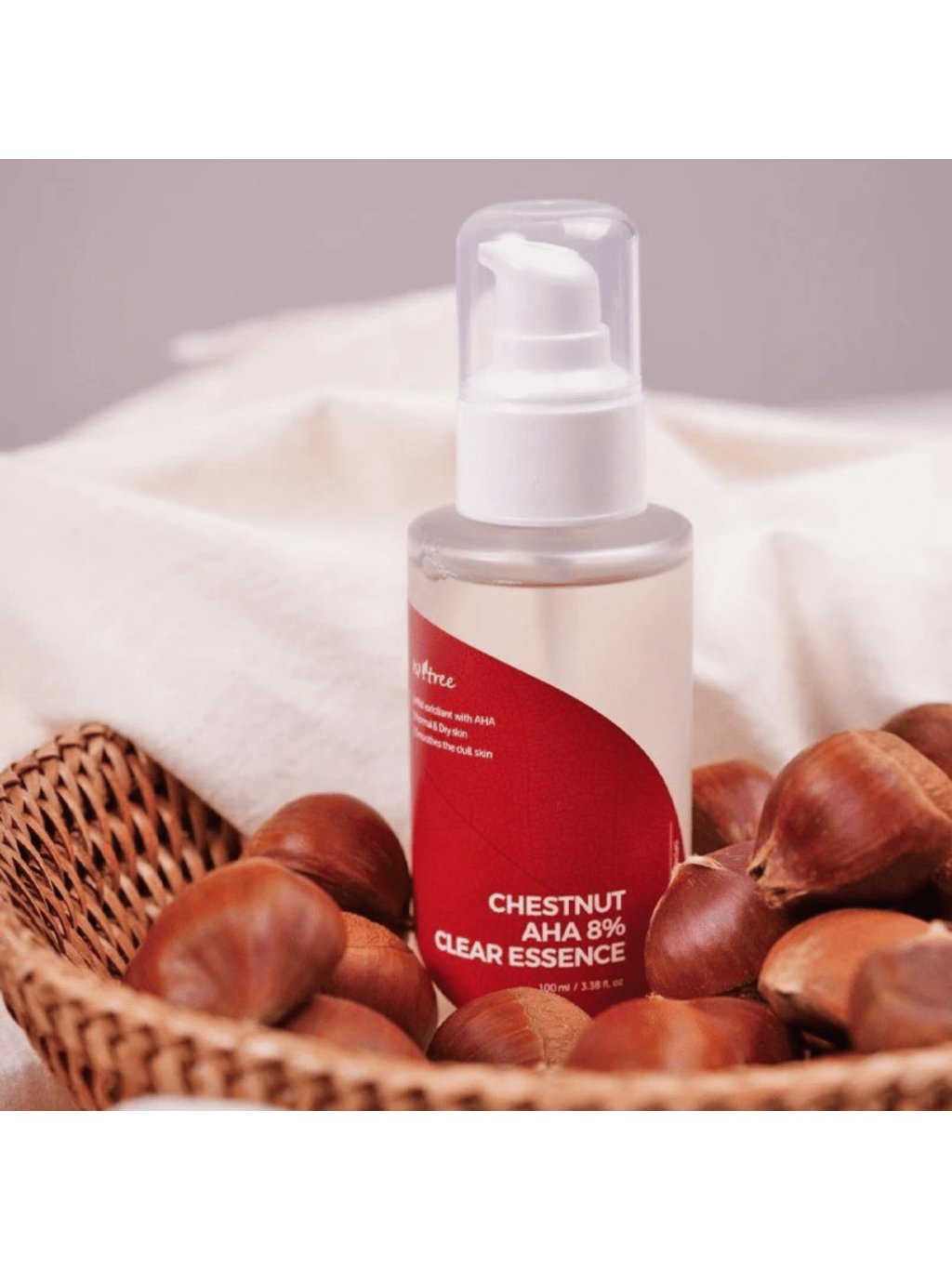 ISNTREE Chestnut AHA 8% Clear Essence je lehká, svěží pleťová esence s jemným peelingem díky kombinaci 4 % kyseliny glykolové a 4 % kyseliny mléčné a extraktu ze skořápek kaštanů. Tato esence rozjasňuje a vyhlazuje pleť, čistí póry a podporuje obnovu pleti. Používejte ji jako další krok po večerním toniku, u citlivé pleti ji začněte používat každé 2-3 noci.