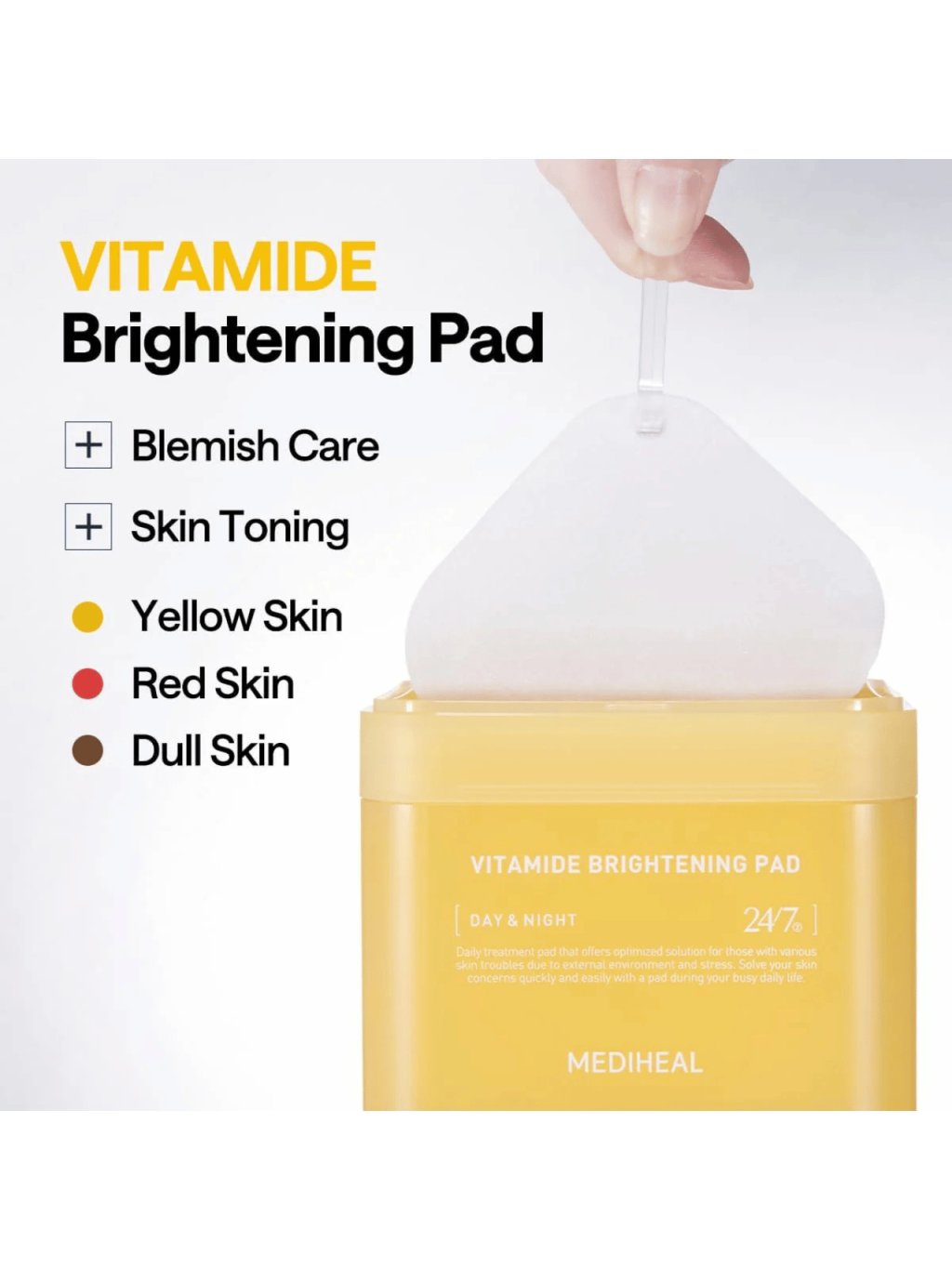 Když chcete získat zářivý vzhled bez námahy, sáhněte po rozjasňujícím polštářku Mediheal Vitamide. Tyto tenké tonizační polštářky, napuštěné 180 ml esence, jsou vaším rychlým trikem ke skvostnému lesku - jemně vyrovnávají tón pleti, vyhlazují její drobné nedokonalosti a zanechávají ji pružnou a svěží. Vitamide Brightening Pad kombinuje účinný niacinamid s vodou Hippophae rhamnoides - rakytníkovou vodou bohatou na vitaminy - a koktejlem dalších vitaminů, jako jsou C, E, A a B-komplex. Díky lipozomálnímu podání (hydrogenovaný lecitin) se účinné látky rychle a cíleně vstřebávají, takže již po prvním použití uvidíte rozjasněnou, probuzenou pleť a hladší povrch. Hydratační složky, jako je hydroxyethylmočovina a betain, doplňují vlhkost, alantoin a glycyrrhizát draselný pleť zklidňují a jemná bylinně-citrusová vůně z přírodních olejů dělá z péče příjemný mini rituál. Tampon můžete také jemně roztáhnout a aplikovat na místa, kde potřebujete extra rozjasnit - pro rychlý efekt lokální masky. Balení 100 kusů se dávkuje pro každodenní použití ráno i večer a díky lehkému nelepivému povrchu se skvěle hodí k líčení. Pokud potřebujete univerzální, rychlý a spolehlivý krok pro rozjasnění a vyrovnání tónu, je to právě tento.
