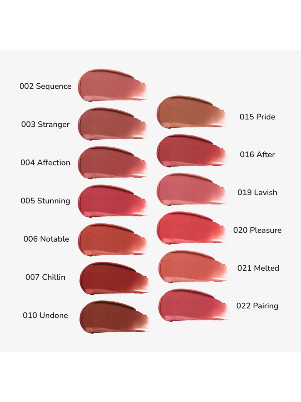 Měkký matný odstín na rty s jemným rozmazávacím efektem pro elegantní růžové rty po celý den.