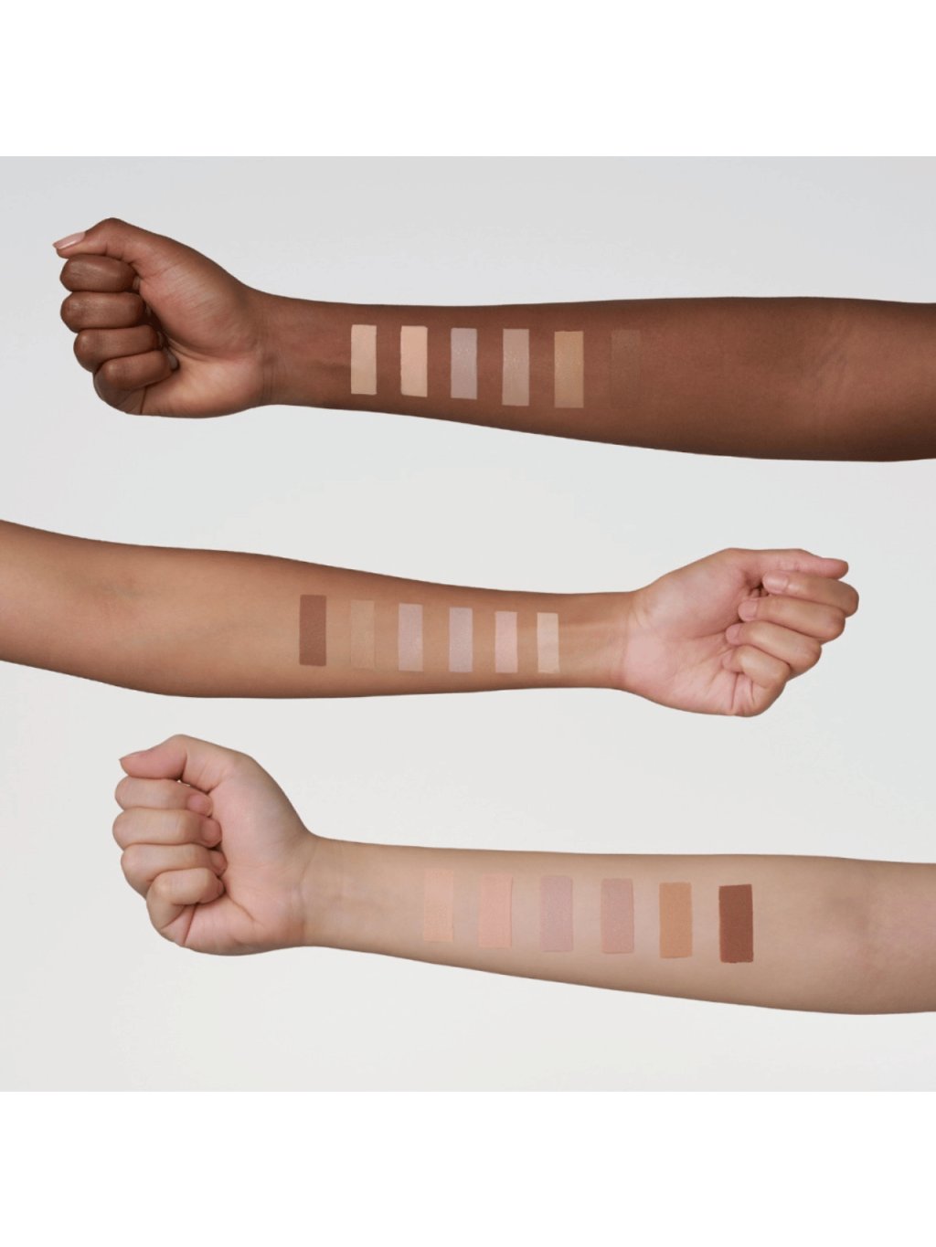 Hladký, krémově tekutý film, který se rozpouští v pokožce a zanechává přirozeně hladký, orosený vzhled bez lepivosti.