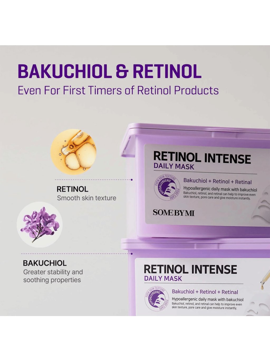 Dopřejte si 30 dní luxusní péče s maskou SOME BY MI - Retinol Intense Daily Mask. Každá maska je napuštěna retinolovou esencí, retinalem, bakuchiolem a 10 druhy kyseliny hyaluronové, které společně bojují proti vráskám, obnovují pružnost a dodávají pleti mladistvý vzhled.
